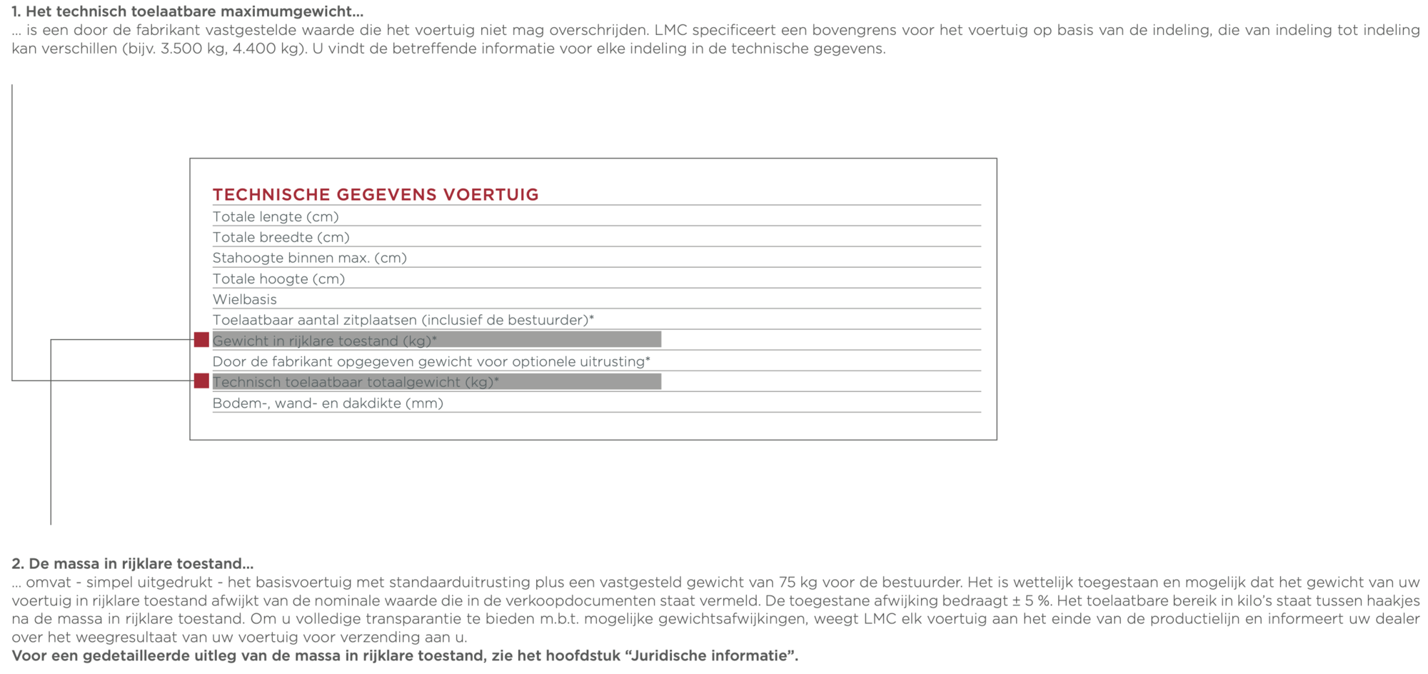 *De technisch toelaatbare maximummassa is een door de fabrikant vastgestelde waarde die het voertuig ook in beladen toestand niet mag overschrijden. Deze heeft dus invloed op het aantal zitplaatsen dat kan worden toegestaan, de mogelijkheden voor het kiezen van optionele uitrusting en het resterende laadvermogen.