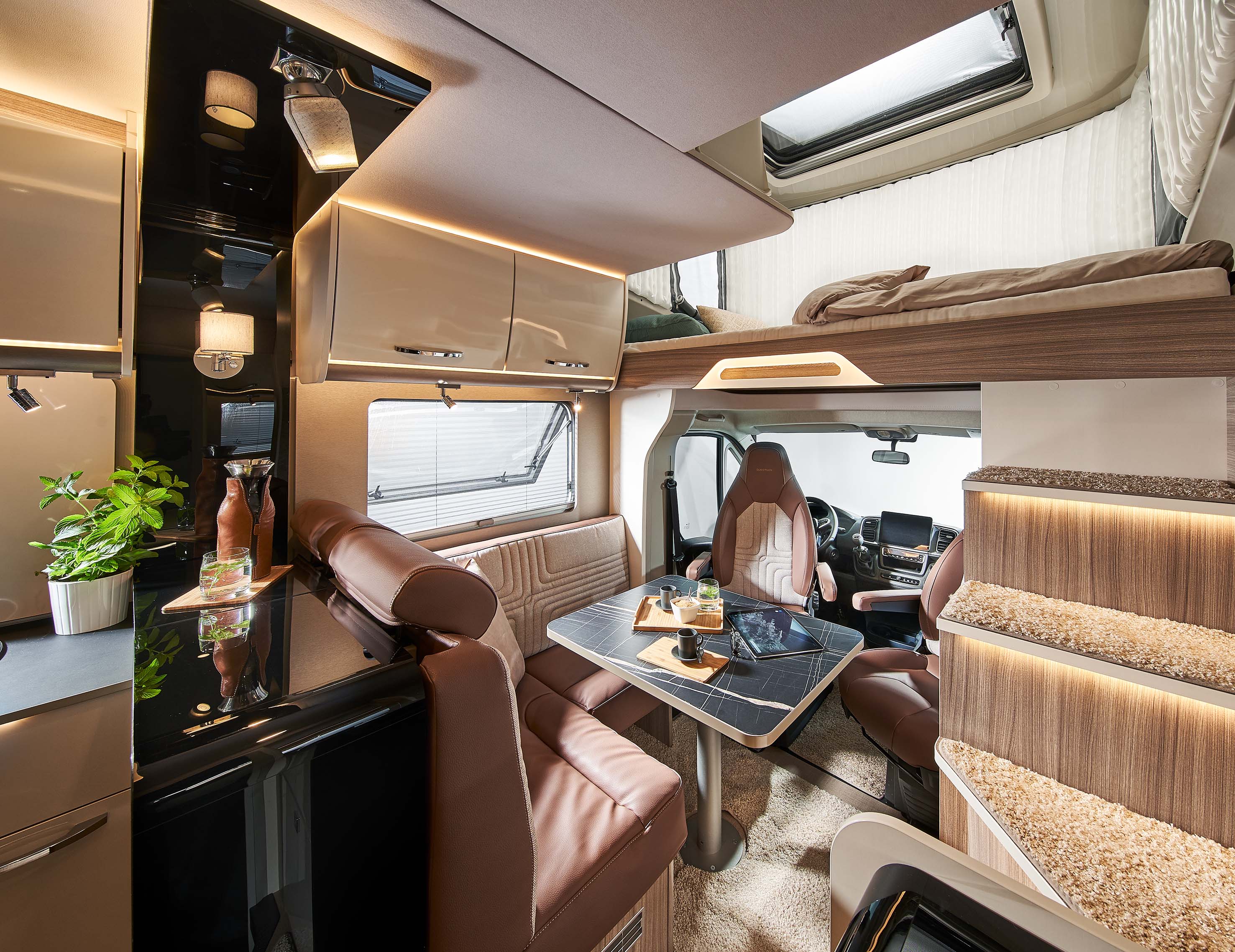 The Lyseo Gallery TD is based on Bürstner's semi-integrated Lyseo TD with a functional Thermo-Floor sandwich floor throughout. With the additional inflatable over-cab alcove, the Lyseo Gallery TD unites the advantages of a coach-built vehicle with those of an over-cab bed model: Its second level is lowered completely and securely locked with an electric locking system whilst travelling, giving the vehicle the streamlined silhouette of a low profile coach-built. Once parked up, the alcove can then be elevated in 90 seconds with the aid of compressed air and a specially developed air chamber system. The vehicle then reaches a maximum body height of approx. 3.7 metres. The over-cab area is not angled like a standard pop-top roof but offers a usable second living floor as it is elevated vertically. A sunroof skylight is also available as an optional extra.