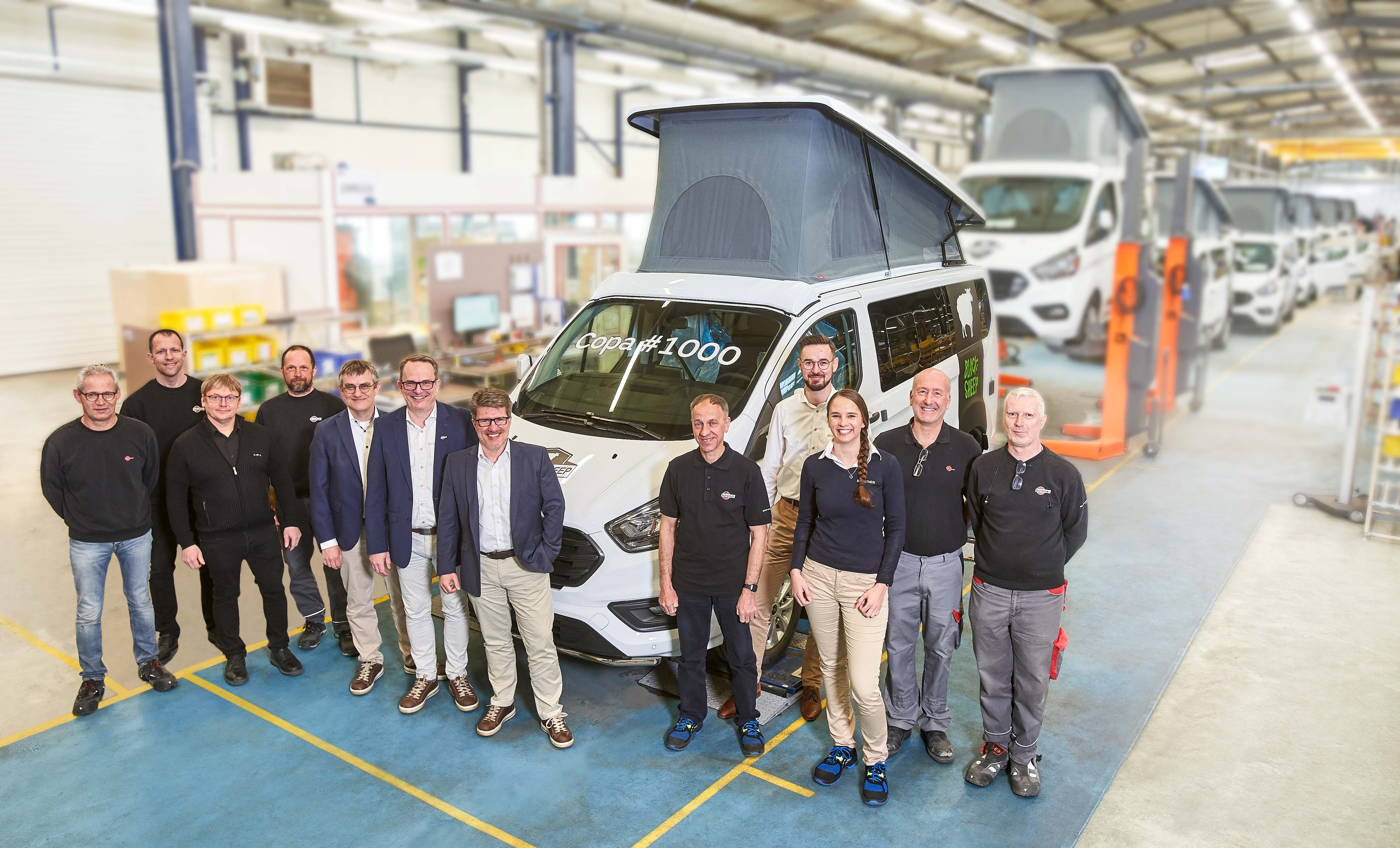 Bürstner celebrated the 1,000th Copa. The managing directors directly in front of the vehicle (from left to right: Alexander Kasteleiner, Jens Kromer, Olaf Sackers), to the right and left of the vehicle: the two assembly line managers as well as the deputy plant manager, the project manager from development/construction, the product manager as well as employee representatives from Wissembourg and the chairman of the Kehl works council.