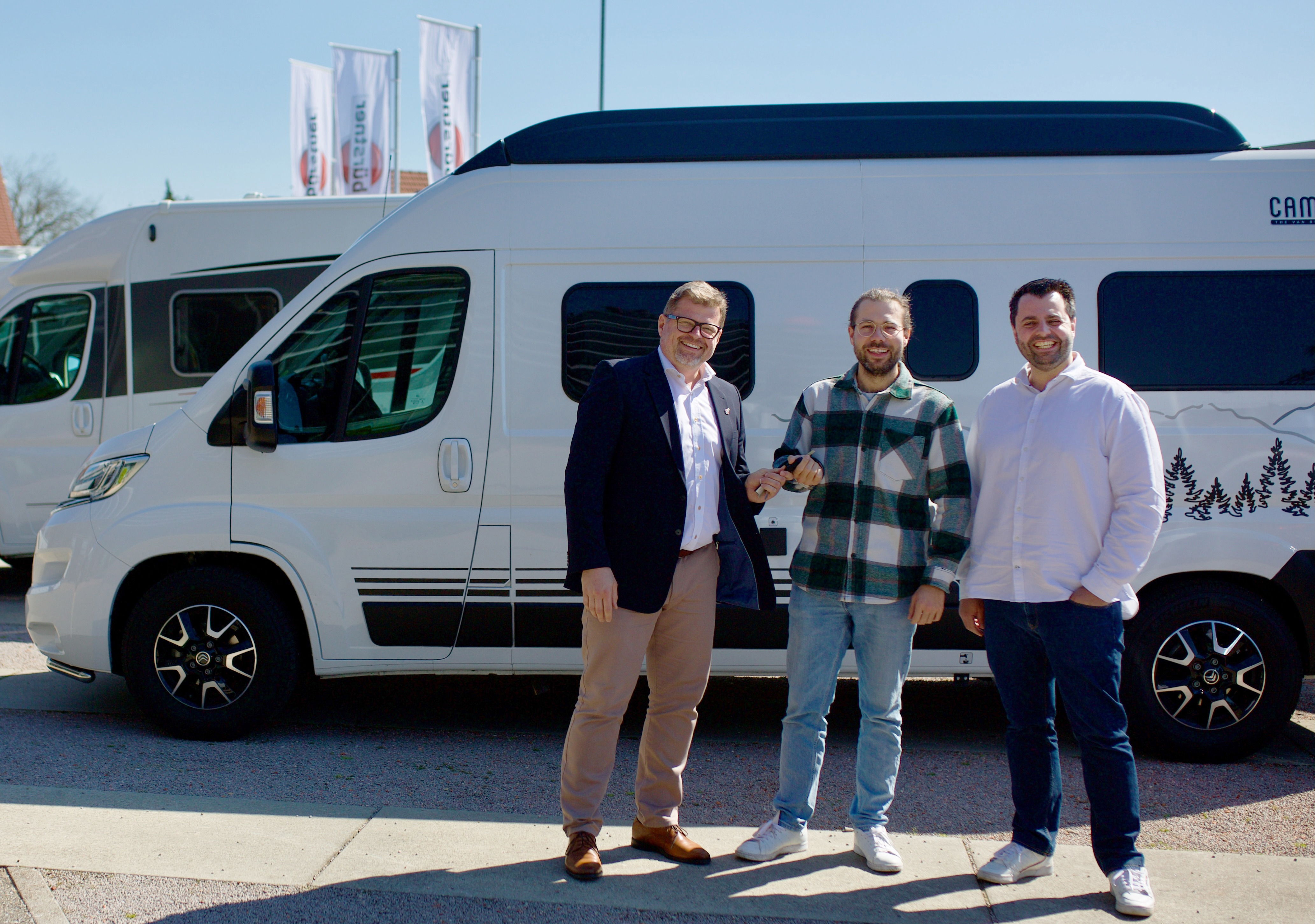 Vehicle handover of the first camper van in Kehl: Bürstner Marketing Manager Thorsten Erhardt (left) hands over the key for a Campeo Black Forest to Dominik Quambusch - Founder & Marketing Manager at AlpacaCamping - (centre) and Christopher Feuerlein - Founder and Sales Manager at AlpacaCamping - (right).
