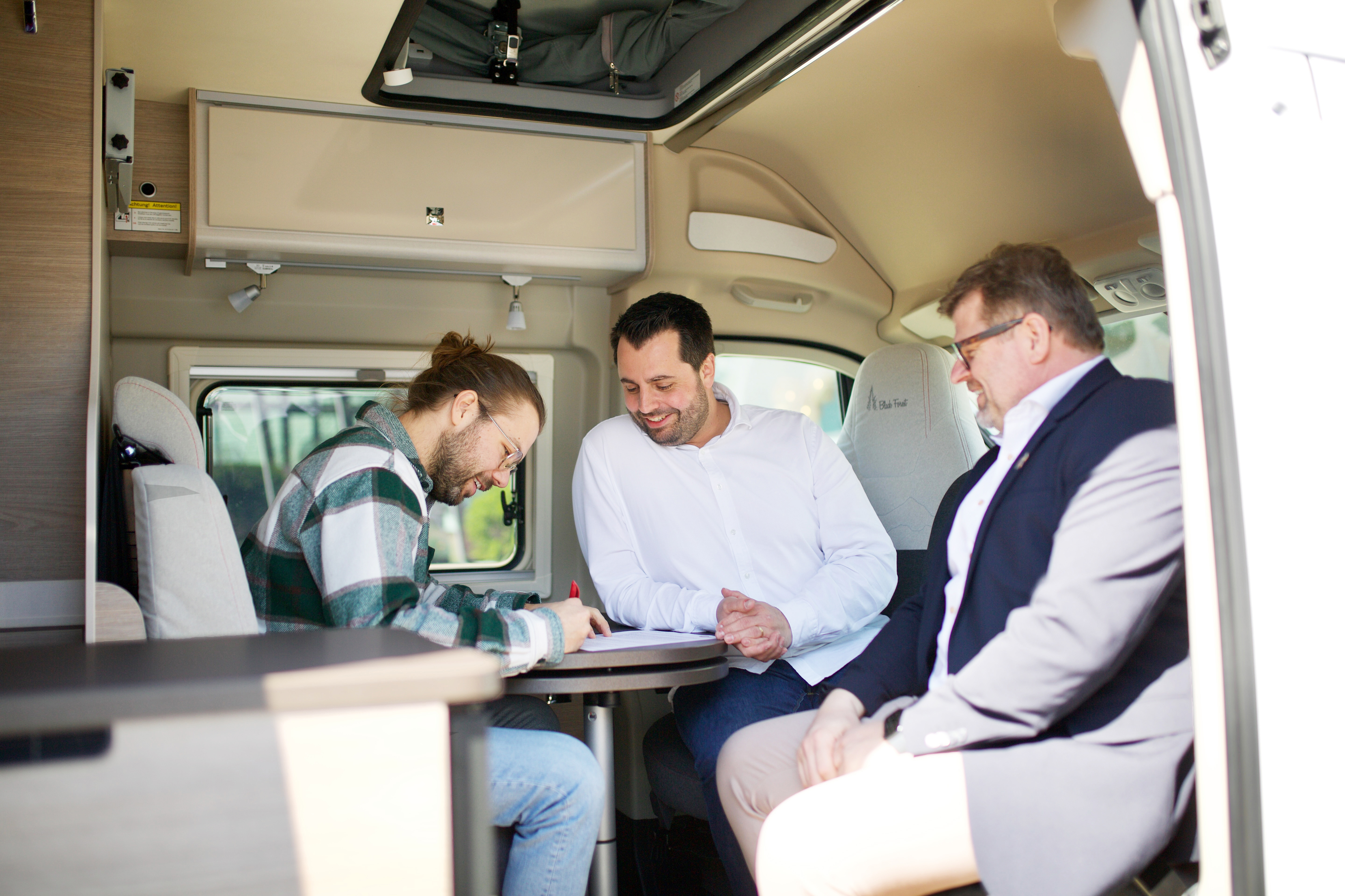 After Thorsten Erhardt, the Marketing Manager of Bürstner (right), the co-founders of AlpacaCamping Dominik Quambusch (left) and Christopher Feuerlein (centre) also sign the joint cooperation agreement in the first vehicle made available in Kehl.