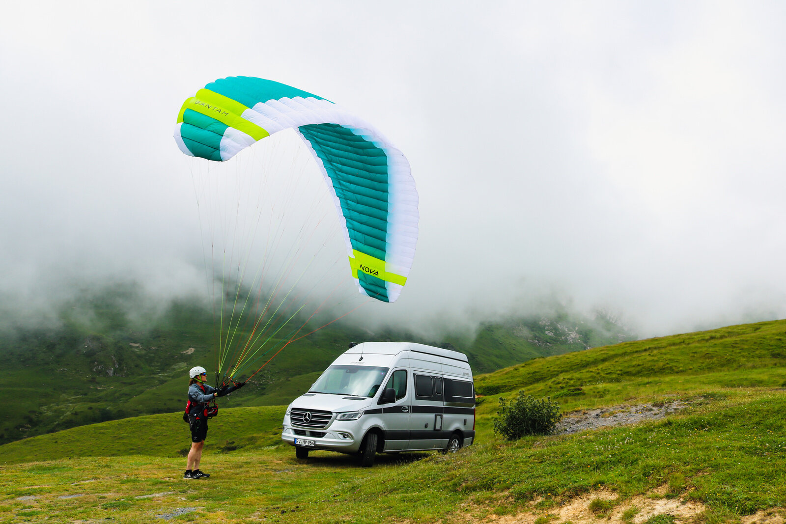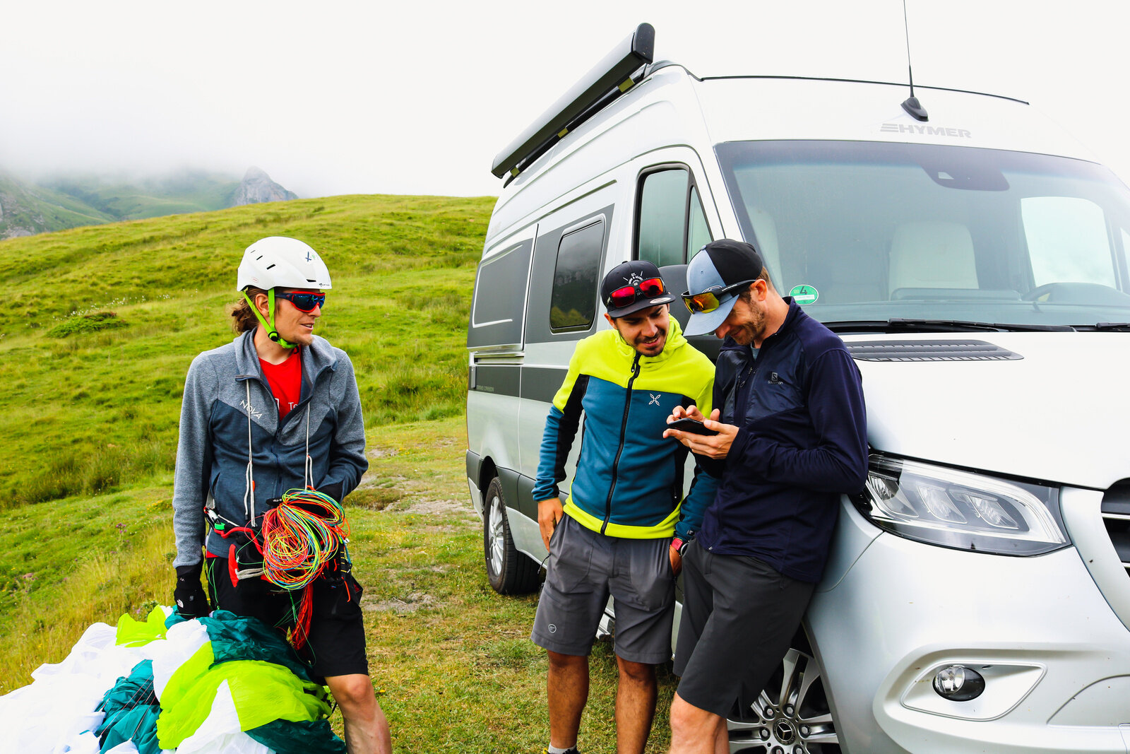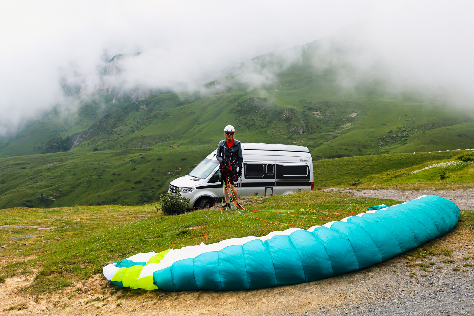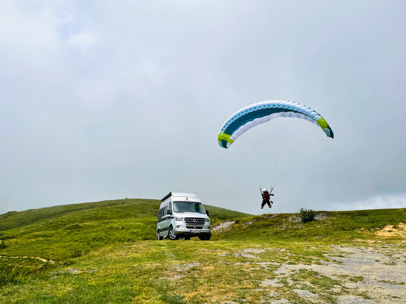 Here, too, the Hymer Grand Canyon S proved to be THE perfect support vehicle: On the one hand, the camper van was big enough to be able to store the necessary luggage and, on the other hand, it was narrow and manoeuvrable, so that it could stop briefly on the narrow country lanes and collect the athlete, they were able to provide changing shoes, food and drink. Due to the rainy weather, only short gliding flights were ever possible, so that the team covered a lot of distance on foot on the first day until bedtime at 9 p.m. What a start!