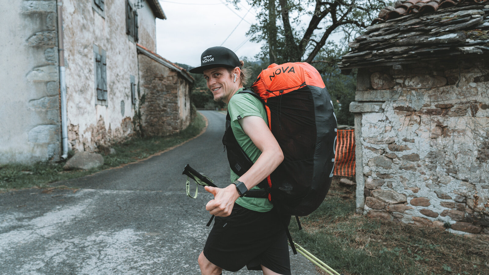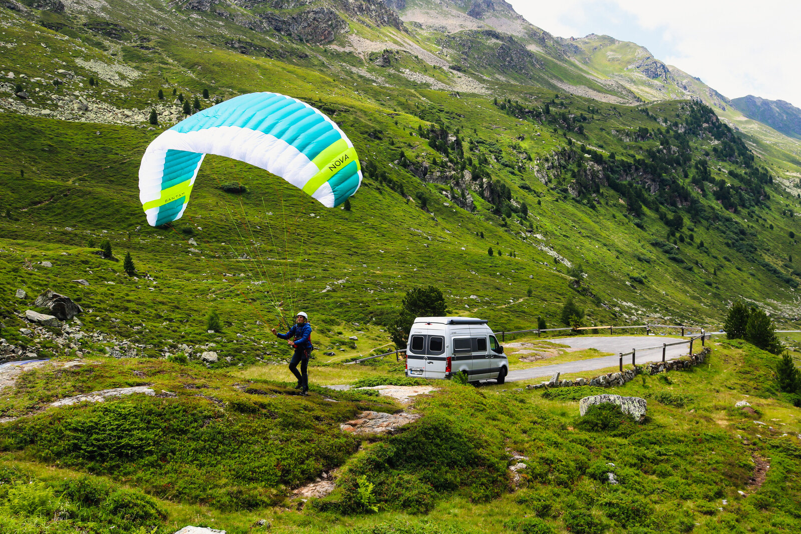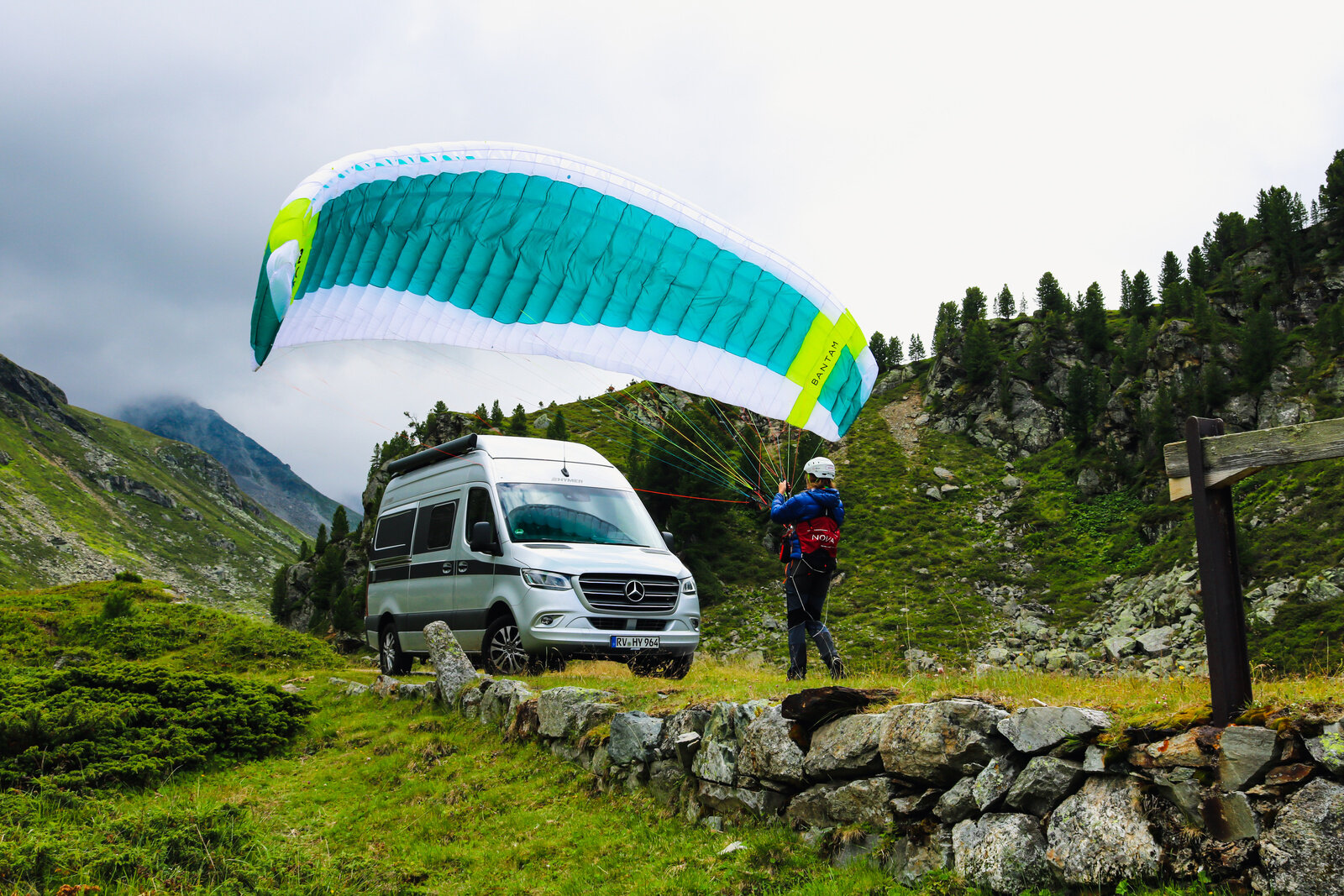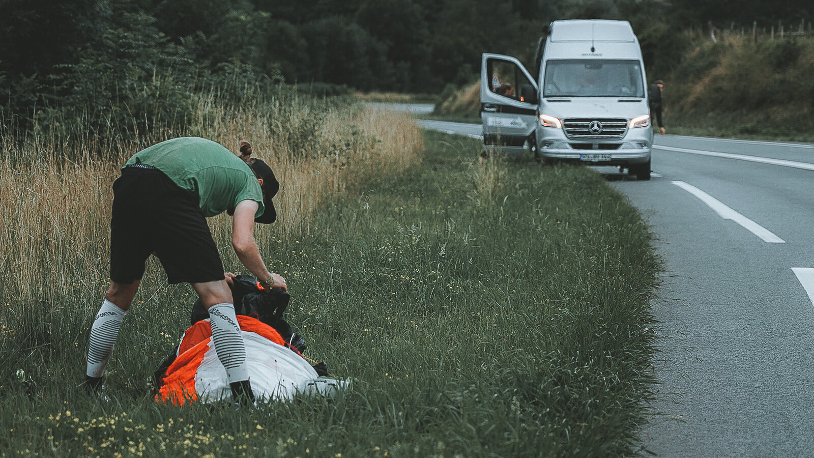 Here, too, the Hymer Grand Canyon S proved to be THE perfect support vehicle: On the one hand, the camper van was big enough to be able to store the necessary luggage and, on the other hand, it was narrow and manoeuvrable, so that it could stop briefly on the narrow country lanes and collect the athlete, they were able to provide changing shoes, food and drink. Due to the rainy weather, only short gliding flights were ever possible, so that the team covered a lot of distance on foot on the first day until bedtime at 9 p.m. What a start!