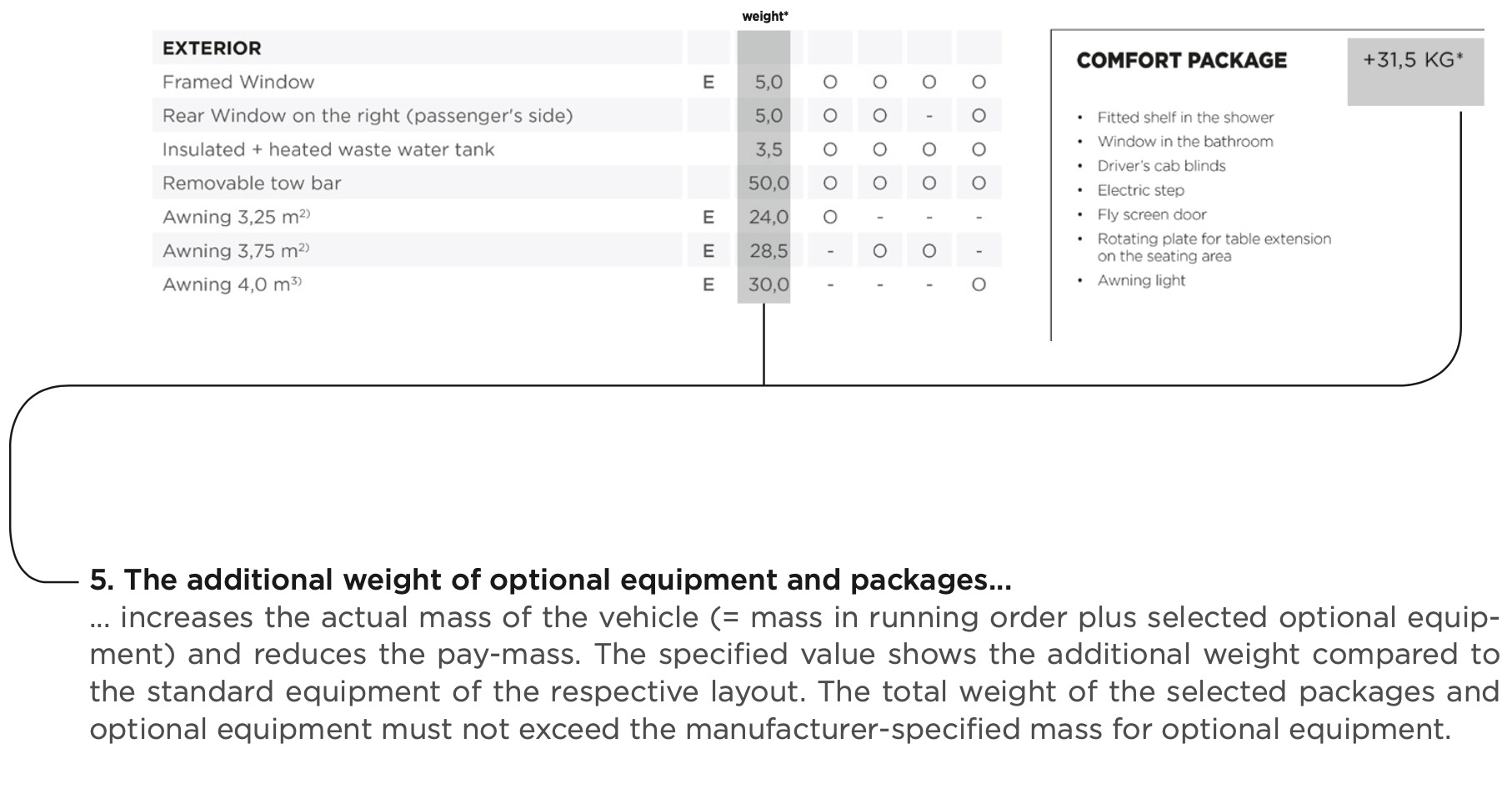 When buying a motorhome, camper van or urban vehicle (hereafter: motorhome), it is particularly important to choose the right layout and an appealing design. In addition, weight also plays an essential role. Family, friends, optional equipment, accessories and baggage – space must be available for all of these. At the same time, there are legal and technical limits to the configuration and load. Every motorhome is designed for a certain weight, which may not be exceeded during driving. For motorhome buyers, this raises the question: How should I configure my vehicle to accommodate passengers, baggage and accessories according to my needs without the vehicle exceeding this maximum weight? In order to make this decision easier for you, we provide you below with a few tips that are particularly important when selecting your vehicle from our portfolio:
