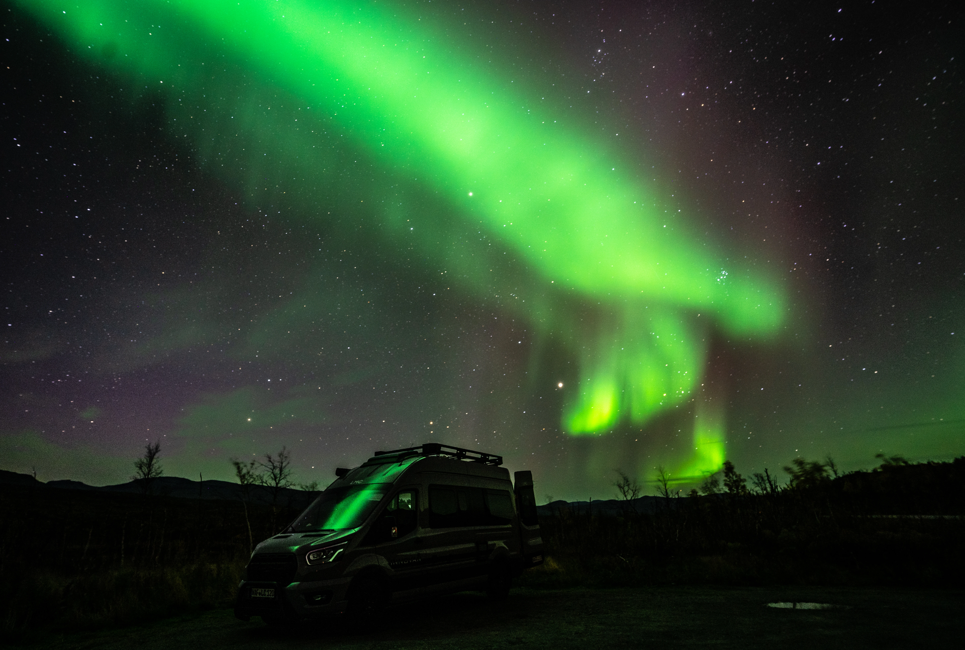 Ce concours de circonstances nous mène à l’une des nuits les plus incroyables de notre périple. Vers 21h, une sonnerie inattendue retentit : l’application des aurores boréales s’est déclenchée. Des aurores en août ? Nous pointons notre téléphone et voyons une tache verdâtre dans le ciel. Nous bondissons hors du lit. Le ciel se dégage, les étoiles apparaissent, et comme par magie, les aurores boréales illuminent le ciel pendant plus d’une heure. Nous n’en croyons pas nos yeux… La tempête et le ferry annulé nous auront finalement permis d’être là pour ce spectacle.