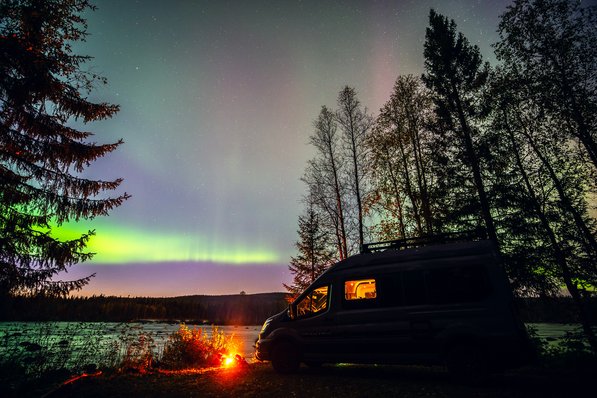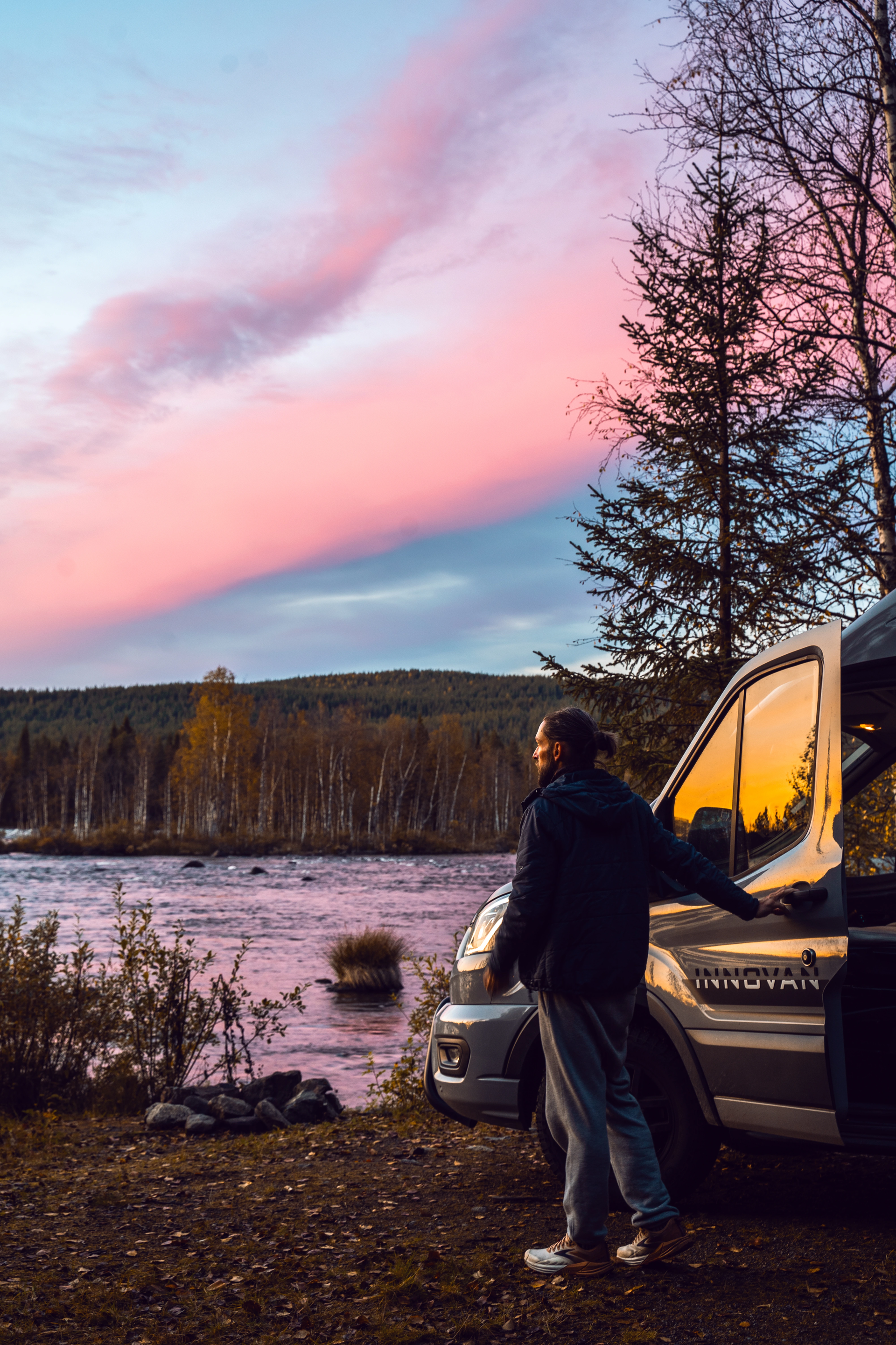Nous arrivons presque en fin de voyage et savons que les 2 derniers jours seront un vrai retour à la civilisation. Il nous fallait un dernier spot où passer une nuit digne de ce nom avant de se retrouver à nouveau en territoire connu. Imaginez un chemin de forêt qui mène à un emplacement unique au bord d’une immense rivière. Un soleil couchant qui doucement cède sa place à un vaste ciel étoilé. Un feu de bois qui vous réchauffe pendant que vous contemplez vos dernières aurores boréales du séjour. C’est ainsi que s’achève un voyage qui nous aura profondément marqué. Loin des problématiques proposées par le monde par défaut, au plus proche de la nature et des éléments tout en profitant du confort de la vie moderne.
