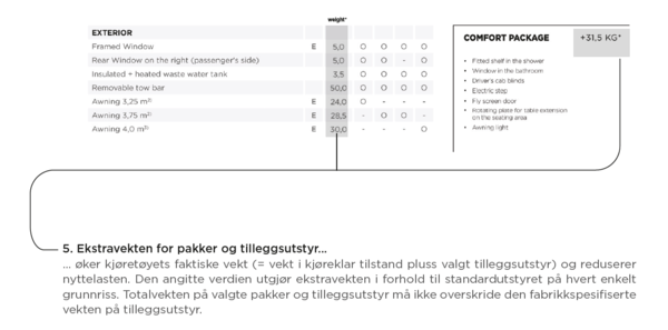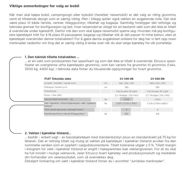Når man skal kjøpe bobil, campingvogn eller bybobil (heretter: reisemobil) er det valg av riktig grunnriss samt et tiltalende design som er særlig viktig. Men i tillegg spiller også vekten en avgjørende rolle. Det skal være plass til både familie, venner, tilleggsutstyr, tilbehør og bagasje. Samtidig foreligger det rettslige og tekniske grenser for konfigurasjon og last. Hver reisemobil er utlagt for en bestemt vekt som det ikke er tillatt å overskride under kjøredrift. Derfor må den som skal kjøpe reisemobil spørre seg: Hvordan må jeg konfigurere kjøretøyet mitt for å få plass til passasjerer, bagasje og tilbehør slik at det passer til mine behov, uten at kjøretøyet overskrider denne totalvekten? For å gjøre denne avgjørelsen enklere for deg har vi ført opp noen merknader nedenfor om ting det er særlig viktig å tenke over når du skal velge kjøretøy fra vår portefølje: