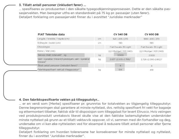 *Teknisk tillatt totalvekt er en verdi som produsenten bestemmer, som kjøretøyet heller ikke får overskride i belastet tilstand. Den har derfor påvirkning på antall sitteplasser som kan tillates, muligheter for valg av spesialutstyr og resterende lastmuligheter.