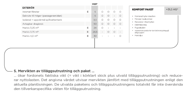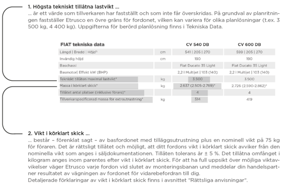 Vid köp av en husbil, campingbil eller Urban Vehicle (nedan kallad husbil) är rätt planlösning och tilltalande design speciellt viktiga. Men även vikten spelar en väsentlig roll. Familj, vänner. tilläggsutrustning, tillbehör och bagage – allt måste få plats. Dessutom finns det rättsliga och tekniska gränser för konfigurationen och belastningen. Varje husbil är dimensionerad för en viss vikt, som inte får överskridas under körningen. Den som köper husbil står därför inför frågan: hur måste jag utforma mitt fordon, så att passagerare, bagage och tillbehör kan få plats enligt mina behov utan att denna maximivikt överskrids? För att underlätta detta beslut för dig får du härnedan några anvisningar som kan vara speciellt viktiga för valet av fordon bland dem som vi erbjuder.