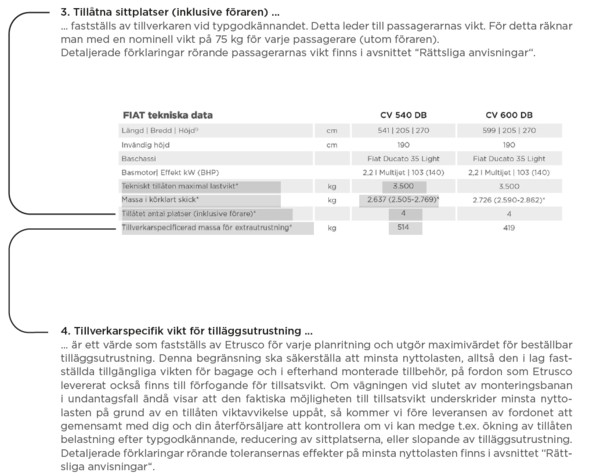 *Den tekniskt tillåtna totalvikten är ett av tillverkaren fastställt värde som fordonet inte får överskrida, ens i lastat skick. Det påverkar därför det antal sittplatser som kan godkännas, möjligheterna till att välja specialutrustning samt återstående möjlighet till extralast. Detaljerad information om vikter och om konfigurationen av fordonet återfinns i våra tekniska data, i avsnittet Juridisk information, samt i konfiguratorn.